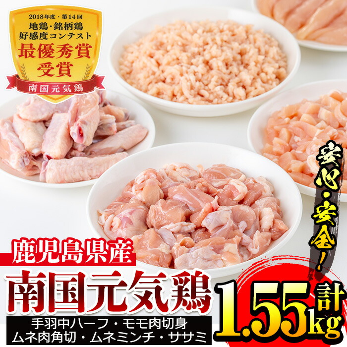 ・南国元気鶏 若鶏モモ肉切身(小さめ):300g ・南国元気鶏 若鶏ムネ肉角切(チャーハン・親子丼用):300g ・南国元気鶏 若鶏ムネミンチ:370g ・南国元気鶏 ササミ:300g |